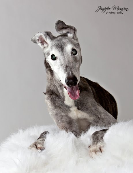 In November 2007, after the loss of my beloved dog Spike to a six-year battle with cancer, the Bluegrass Barkery and I teamed up to help raise money for canine cancer research. Spike had only been gone less than a month when I found myself standing in the kitchen of the Clay Avenue store taking pictures of patient dogs along with an even more patient Santa, Jim Harvey. I felt like I was standing in a dream as I was still in such great mourning over the loss of Spike and taking pictures to honor her death, did not seem real to me. Dog after dog and picture after picture, my day was moving along as usual with bouncy dogs and wagging tails; that is until I saw Niles. I had turned my head to glance into the store to see how many people were standing in line waiting for photos, when I noticed a large elderly greyhound standing quietly by his owner’s side. The main door to the Barkery was open as I saw them in near silhouette form. I could see from a glance that Niles was an older dog (one of the first that I had seen all day long). At that moment the room was silent and thoughts of my old dog Spike came flooding back to me. Spike was one day shy of her 14th birthday when she passed away; she has always looked so young and so strong up until six months before her death. The cancer and her diabetes had taken a toll on her once beautifully muscled body. I had to look away from Niles as I felt my eyes well up in tears, somehow he and Spike felt like one dog. As the afternoon rolled on, Niles found his way into the little make shift studio at the Barkery to have his photos taken with Santa. I stood in the corner filling out orders all the while I had one ear listening to Niles’s owner Robert, talk about Niles health. Robert talked about all the vet appointments, different medications, modifying the house, etc. So many of the same things my husband and I did for our baby girl Spike. So many similarities were stacking up for Niles and Spike, that Niles immediately found a special place in my heart. I remember clearly how Robert came over to pick out his selection of photos for printing and through the tears that were now streaming down my face; I offered him the entire CD of all the photos taken. I knew in my heart that time had become precious for the two. I think in death that we truly learn how precious life is, how precious time with those we love is. That was where my journey with Niles began. We spent many years in studio sessions at my house along with Santa photos at the Bluegrass Barkery. I always looked forward to petting Niles beautiful soft gray coat, and smelling his natural baby-powder-like scent. Niles was a special dog. He lived to the age of fifteen, an age that is unheard of for greyhounds. I know in my heart that the love of his owners kept Niles alive. Next to their lives, love was the most beautiful thing they shared together. Goodbye sweet Niles, may Spike be there greet you as you leave this life behind and race off toward